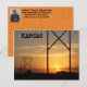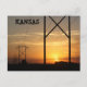 Uma foto de uma linha do Kansas Power Sunset com silhuetas com uma laranja brilhante, e céu amarelo. É a oeste de Nickerson Kansas. Está num cartão POSTE.