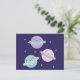 Planetas bonitos com rostos kawaii e minúsculas estrelas no espaço. Colores de Pastel em um fundo azul escuro.