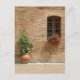 Janela de madeira guardada numa parede de tijolos vermelhos da Tuscana com flores na janela e um pote de talha no pátio abaixo
