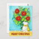 Envie esta carta de urso polar para desejar aos amigos e à família um Feliz Natal. No lado direito deste cartão, um urso polar está segurando um buquê gigante de Poinsettias vermelhas, uma flor tradicional de natal usada com frequência na decoração floral no inverno. O ursinho está vestindo um lenço amarelo brilhante, apertado com um nó simples na parte de trás do pescoço. Ele está diante de um terreno negro azul e sobre uma flor amarela na qual se escrevem cartas escritas à mão "Feliz Natal". As letras são marrons. Flocos de neve brancos pequenos estão espalhados sobre a pintura.