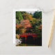 Fotografia de uma ponte vermelha japonesa sobre uma lagoa no Templo de Daigo, em Quioto, com árvores de outono ao fundo.