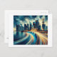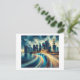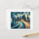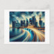 Uma paisagem urbana vibrante mostra arranha-céus torcendo e um céu girando cheio de padrões dinâmicos. A ponte iluminada e as luzes de circulação dos veículos criam uma atmosfera energética.