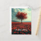 Esta imagem retrata uma paisagem deslumbrante com uma árvore solitária no centro de um vasto campo de flores vermelhas vibrantes, provavelmente papoulas. A árvore, também adornada com folhagem vermelha, destaca-se contra um pano de fundo de colinas ondulantes e um céu repleto de nuvens dispersas. Os tons quentes e ricos das flores vermelhas criam um contraste marcante com os azuis e verdes frescos do céu e da paisagem distante, evocando uma sensação de tranquilidade e beleza natural. A cena parece serena e quase surreal, como se capturada no auge do florescimento da natureza.