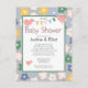 Este convite de chá de fraldas por correio apresenta flores, pássaros e bunting em uma combinação cor-de-rosa, verde e amarela em um fundo de cinza mole. O verso pode ser personalizado para incluir o nome do bebê. No verso está um padrão de flores amarelas repetidas em uma cinza. Todo texto pode ser personalizado na página do produto.