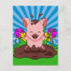 Porco rosa bonito brincando alegremente numa piscina de lama marrom. Atrás dele estão algumas flores coloridas, grama verde e um céu azul de explosão solar.
