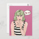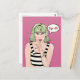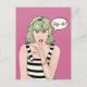 Uma ilustração do estilo pop da arte de uma mulher com um segredo para você. Ela está vestindo um vestido listrado preto e branco e tem os dedos na lábios, pedindo que você seja bem. Zip!