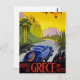 Poster de Grécia restaurada e aprimorada digitalmente. A poster mostra um carro dirigindo ao longo de uma estrada de montanha em Grécias. Um mosteiro está no penhasco à esquerda. Imperfeições removidas e cores corrigidas. Imagem cortesia da Biblioteca do Congresso.