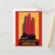 Poster de viagens vintage restaurada e melhorada digitalmente mostrando arranha-céus com edifícios menores. Imperfeições removidas. Cores corrigidas. Imagem cortesia da Biblioteca do Congresso.