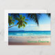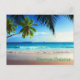 Foto perfeita num dia perfeito nos trópicos! Ondas tropicais azuis, praia tropical branca arenosa com palmeiras verdes e peludas. O dia está ensolarado e quente com um céu azul lito nesta cena de praia do paraíso na ilha tropical.