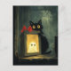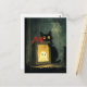 Uma cena divertida do Dia das Bruxas com um fantasma em uma caixa de presentes guardada por um gato preto em seus braços