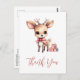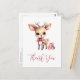 Cartão de agradecimento com uma ilustração de um adorável cervo bebê. Olhos grandes orelhas grandes com uma cabeça grande e pequenos chifres marrons. Usando um grande laço vermelho. De pé ao lado de uma pilha de presentes.