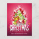 Cartão postal de Natal com uma legal ilustração de Natal. O texto diz Feliz Natal e Feliz ano novo. Projetado com um monte em forma de árvore de presentes com flocos de neve festivos, estrelas, bausolas de natal e faíscas brilhantes. O fundo é uma cor rosa avermelhada vibrante.