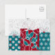 Cartão-postal de Presentes Vermelhos Suecos Modernos. Nossa vintage arte folclórica escandinava vermelha e azul de feriado em presentes embrulhados com um delicado fundo floral branco.