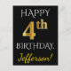 Cartão Postal Preto, Faux Dourado 4º aniversário + Nome Personal