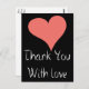 Neste moderno dia da tecnologia escrita à mão, os agradecimentos estão se tornando uma arte perdida. Por que não iluminar o dia de alguém com uma nota surpresa de obrigados. Doces e simples, este cartão postal bonito apresenta um grande coração cor-de-rosa com Obrigado por amar impresso em uma fonte branca fácil de ler destacada contra um fundo preto a jato. A parte de trás do cartão postal é vazio da sua mensagem pessoal. Obrigado cartões postais são excelentes para... * Casamentos / chás de panela / festas de noivado * Atos de gentileza * Empresas * Apreciação por presentes * Notas pessoais * Fundraisers / instituições de caridade * Dons de papelaria - cartões de gravura juntamente com uma fita Role para baixo para ver outros cartões postais de que você possa desfrutar.