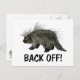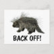 Envie este cartão para tirar os colecionadores de faturas ou os sogros das suas costas. A imagem apresenta um porcupine e o aviso "Back Off!" Um porco-espinho é qualquer uma das 29 espécies de roedores de várias famílias. Os Porcupinos são indígenas das Américas, do Sul da Ásia e da África. Os porquinhos são o terceiro maior dos roedores, atrás da capybara e do castor. A maioria dos porquinhos tem cerca de 25-36 pol. (63-91 cm) de comprimento, com uma cauda de 8-10 pol. (20-25 cm) de comprimento. Pesando entre 5,4 e 16 kg (12-35 lb), são arredondados, grandes e lentos. Porcupinos vêm em vários tons de marrom, cinzas, e o branco incomum. A proteção espinhosa de Porcupines se assemelha à dos ouriços e echidnas não relacionados. O nome porcupina vem da espinha porcina do meio francês (porco espinhado) Um nome regional americano para o animal é porco-porco. O porco-espinho norte-americano, Erethizon dorsatum, tem a faixa mais setentrional de todos os porquinhos do mundo. As evidências indicam que eles só fizeram parte da fauna norte-americana, sincemilhões que migraram do norte da América do Sul há cerca de três milhões de anos. Porquinhos têm de 25 a 31 polegadas de comprimento recobertos por pêlos e colchas de comprimento variável, exceto nos pés e nariz. As pontas dos pêlos longos da guarda são mais leves e dão a casaco de amarelo ou branco. O cabelo e uma grossa camada de gordura corporal ajudam a manter o porco-espinho quente durante o inverno. A cauda é extremamente muscular e adaptada à ajuda à escalada e à defesa. A superfície superior da cauda é muito coberta de colchas, enquanto a parte inferior é coberta por pêlos cerrados usados para escalar. A pelagem de porco-espinho encharcada o torna único entre os mamíferos norte-americanos. As coinas cobrir o corpo, exceto nas pernas e na barriga. As colchas são pelos modificados, que possuem hastes microscópicas nas pontas e são preenchidas com uma matriz esponjosa. As calhas de diferentes partes do corpo variam em comprimento, flexibilidade, cor, diâmetro do eixo e comprimento da barba. O peso médio de uma porquina adulta masculina varia de 15 a 18 libras, mas alguns indivíduos podem pesar até 30 libras. As fêmeas adultas pesam cerca de 2-4 libras menos do que os machos. Porcupina tem excelentes sentidos de cheiro, audição e paladar, mas relativamente fraca visão. Os Porcupinos fazem uma grande variedade de sons que vão de whimpers a gritares, dependendo das circunstâncias. A reprodução ocorre nos meses de outono, do final de setembro ao início de novembro. Machos que procuram fêmeas receptivas ampliam suas gamas de casas até cinco vezes o tamanho normal. Se mais de um macho se interessar pela mesma fêmea, lutará pela oportunidade de acasalar com a fêmea. Os machos usam os dentes incisivos e as colchas na luta, e geralmente é o maior e mais pesado macho que ganha dominação. O macho em reprodução então esfrega a fêmea com urina. Se não estiver pronta para acasalar, ela sacude a urina e sai. Se estiver pronta, ela fica e o macho se monta na postura tradicional com a fêmea à frente e o macho na retaguarda. Ela vai enrolar a cauda sobre as costas, cobrindo a maioria das colchas. Os homens atingem a maturidade aos 24 meses e as mulheres aos 12 meses. Após um período de gestação de cerca de 210 dias, apenas um solteiro jovem é nascer. O período de gestação é extremamente longo para um roedor, o dobro do tempo para um castor. Ao nascer, os jovens pesam entre 1 e 2 quilos e têm cerca de 10 polegadas de comprimento. Seus olhos estão abertos e seu corpo coberto de longos pêlos e colchas de preto-cinza. Em questão de horas as colchas secam e servem de proteção. A porcupina jovem é então capaz de seguir sua mãe, embora os jovens não consigam subir árvores grandes por várias semanas. Os jovens conseguem comer alguma vegetação depois de algumas semanas, mas a fêmea continua amamentando os jovens por 3,5 meses. Durante o verão, os jovens ficam perto das mães, aprendendo sobre as áreas de pouso e árvores de comida, mas no final do verão começam a passar mais tempo separados. Em outubro, quando as companheiras de novo, os jovens estão completamente desmamados e caminham para enfrentar o inverno sozinhos. Os Porcupines utilizam cavidades naturais, como cavernas de rocha, toras ocas e árvores, ou até a vegetação mais espessa de uma árvore como as plantações. Em áreas sem queda de neve, os jardins não são muito usados. Os Porcupines permanecem ativos durante o inverno. Porcupinos são principalmente arborícolas, e passam a maior parte do seu tempo no inverno se alimentando em árvores. Enquanto alpinistas poderosos, os porquinhos caem de árvores. Trinta por cento dos animais examinados em um estudo mostraram evidências de fraturas cicatrizadas indicando que caíram das árvores. Ao subir, o porco-espinho usa como suporte as cerdas rígidas na superfície inferior da cauda. O animal tem garras frontais longas e curvas que também ajudam a subir. O latido interior (camadas floema e cambium) de agulhas de spruce, pássaro, hemlock e spruce são as grandes comidas de inverno para a porcupina que vive no Alasca. Na primavera e no Verão, comem-se gomos e folhas verdes jovens de pássaros, aspentes, madeira de algodão e salgueiro até que os níveis de taninos se acumulem demasiado elevados para que o porco-espinho tolere. Por serem vegetarianos e a maior parte da matéria vegetal ser muito baixa em sódio, os porquinhos precisam de sódio adicional no sangue para equilibrar os níveis de potássio celular. Como resultado, os porquinhos buscam fontes de sal como os porcos naturais, cola que liga o contraplacado, transpiração humana em ferramentas, sal rodoviário, e algumas tintas. Porcupinas também se alimentam de galhadas e ossos de animais mortos para obtenção de sódio e cálcio. A maioria dos carnívoros não deixaria passar uma refei