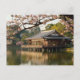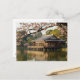 Jardins japoneses são tão bonitos! Este cartão-postal apresenta uma cena de primavera com uma sala de madeira construída sobre uma lagoa tranquila. No primeiro plano, um galho carregado de quadros de cereja floresce a cena.