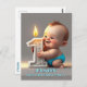 Imagem retrata o primeiro aniversário de um bebê menino. O bebê está abraçando uma vela acesa celebrando seu primeiro ano de vida. O menino está mostrando um grande sorriso. Vamos tornar essa festa inesquecível.