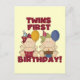 Gêmeos, camisetas de primeiro aniversário, fusíveis, cartas, posters, guardas e mais gêmeos de meninas em chapéus de festa, balões, e texto que diz "Gêmeos Primeiro Aniversário!".