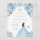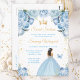 Este convite de aniversário de dezesseis anos doce e elegante apresenta uma bela princesa com cabelos castanhos em uma linda capa de gala azul clara. O texto combina caligrafia manuscrita e fontes modernas sem serifa para um visual sofisticado e elegante. Os arranjos florais, borboleta e confetes dourados criam a combinação perfeita de rústico e chique.