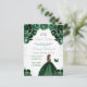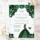 Este convite de aniversário doce dezesseis elegante e glamoroso apresenta uma bela princesa com cabelos castanhos em um vestido de baile verde escuro. O texto combina caligrafia manuscrita e fontes modernas sem serifa para um visual clássico e sofisticado. As arranjos florais, borboleta e confetes prateados criam a combinação perfeita de rústico e chique.