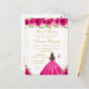 Este convite de aniversário de dezesseis anos doce e elegante apresenta uma bela princesa com cabelos castanhos e pele clara em um vestido de baile rosa quente. O texto combina caligrafia manuscrita e fontes modernas sem serifa para um visual sofisticado e elegante. As arranjos florais, borboletas e confetes dourados criam a combinação perfeita de rústico e chique.