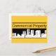 Edifícios simplistas em preto e branco. "Propriedade comercial" acima e uma linha acima disso. Personalize como você deseja incluir o nome da sua empresa e as informações de contato.
