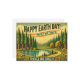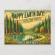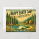 Aqui está o viagem, estilo vintage, para o Feliz Dia da Terra, com uma floresta cênica com pinheiros altos, uma trilha sinuosa, e um lago pacífico. 🌿 🌎 ✨ A design tem cores esmaecidas e brilhantes com a tipografia retrógrada a ler "Proteger as nossas florestas!".