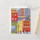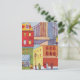 Pintura colorida e moderna de uma rua com pessoas com uma ponte ao fundo