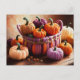 Esta trabalho de arte é de abóboras crochadas em uma cesta roxa.