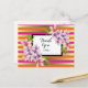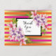 Um obrigado de festas que você postcard com um padrão elegante composto por listras horizontais metálicas cor-de-rosa, laranja e falsa douradas. A camada sobre o topo é um quadro com uma borda preta. Flores grandes, cor-de-água, cor-de-rosa e púrpura, magnólias, com sotaques verdes, enfeitam o design. Texto na frente diz: "Obrigado" com uma mensagem na parte de trás que pode ser personalizada.