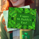 Ruas felizes. Cartões postais do Dia do Paddy. Quatro pavimentações de folha e design de argila verde em tons de verde. É fácil mudar o texto impresso na parte frontal. O reverso é vazio com um padrão de fundo de trevo de luz.