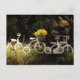 Foto de quatro triciclos brancos em uma encosta de capim. No carro de uma trilha está um pote de mães amarelas.