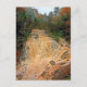 Uma cachoeira de água lamacenta mergulha sobre rochas entre árvores de queda.