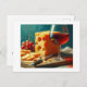 Um grande bloco de queijo suíço está sentado num conselho de corte de madeira próximo a um copo de vinho tinto, acompanhado de um aglomerado de uvas vermelhas. Uma variedade de fatias de queijo e uma faca também aparecem em cena de forma destacada.