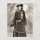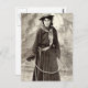 Vintage foto de uma mulher do velho oeste americano. Ela está vestida com um cheio de roupas compridas de manga, vestindo um grande cachecol e chapéu. Ela tem um cinto de segurança com uma arma no coldre e ela está segurando um lasso