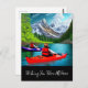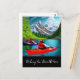 Mantenha-se em contato com este postal mostrando um casal de crianças em caiaques em um lago cercado por pinheiros e neve coberto de montanhas com reflexões maravilhosas na água.