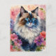 O cartão postal apresenta uma delicada trabalho de arte de aquarela de um lindo gato boneco de pano cercado por flores em um retrato estético feminino de um animal. O felino de olhos azuis está olhando para fora deste vibrante quadro floral.