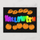 Feliz cartão postal do Rainbow Halloween sobre fundo preto com letras arco-íris e abóboras laranja.