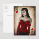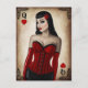 Estilo da rainha do design de corações com efeitos fortes. Apresenta uma ilustração de uma linda jovem, com cabelos longos e pretos, vestindo um espartilho vermelho.