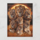 Leões majestosos ficam diante de uma lua cheio luminosa, suas silhuetas iluminadas contra o céu noturno. O luar banha a cena num brilho místico, capturando a beleza selvagem destas criaturas poderosas.