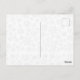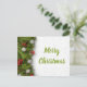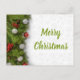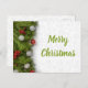 Este cartão-postal apresenta ramificações de pinheiros verdes com borbulhas vermelhas e prateadas e texto de "Feliz Natal" com letra verde correspondente no lado frontal. O padrão de floco de neve de cinzas leves está no fundo em ambos os lados.
