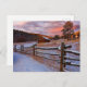 Esta foto apresenta um celeiro rústico coberto de neve em frente a um pôr do sol lindo em um rancho do Colorado.