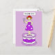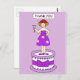 Uma moça de desenho fica em um bolo gigante, vestindo um chapéu vermelho e um vestido de mauve. A senhora está segurando um coquetel com uma mão e dizendo "Obrigado".