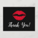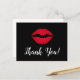 Bright red ombre style lipstick kiss impressão com uma mensagem personalizável de caligrafia "Obrigado!". Crie seu próprio obrigado, seus cartões postais. A imagem é independente da mensagem de texto, deixando-o livre para personalizar o tamanho e posicionamento dos lábios. Fundo preto com letra branca de caligrafia. Se você transferir seu design personalizado para outro produto, poderá escolher sua cor de fundo favorita. Crie seu próprio chá de panela ou obrigado de festa de solteira que você faz postais.