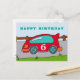 Carro de corrida. Cartaz de aniversário feliz. Um cartão de aniversário personalizável. Este cartão-postal tem um carro de corrida vermelho dirigindo na estrada. O carro tem um número de idade. O carro de corrida faz deste excelente um cartão de aniversário feliz para a saudação de aniversário de um menino. Você pode personalizá-lo mudando o número de idade no carro de corrida. Você também pode fantasiar o texto Feliz aniversário para outras ocasiões.