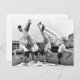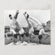 Este cartão postal apresenta uma fotografia antiga de quatro ginastas masculinos mostrando suas habilidades enquanto desfrutam de uma refeição "equilibrada".