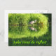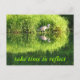 A grua se reflete na água de uma lagoa com as brilhantes cores verdes ou ervas daninhas e árvores ao fundo. As palavras "levar tempo para refletir" são impressas no item.