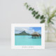 Cartão-postal com uma estância de bungalow superd'água de luxo na clara lagoa azul da ilha pacífica de Bora Bora, perto de Tahiti, na Polinésia Francesa, com uma fronteira branca, e o texto: "Bora Bora".