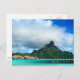 Cartão-postal de um resort aquático na fantástica lagoa turquesa de Bora Bora com Mt. Otemanu ao fundo na Polinésia Francesa perto do Taiti com um bar fraco e o texto: "Bora Bora".
